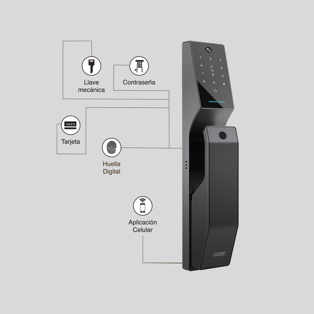 Acceso versátil: Ingresa mediante huella digital, contraseña, tarjeta IC, llave mecánica o a través de la App móvil vía Wifi.