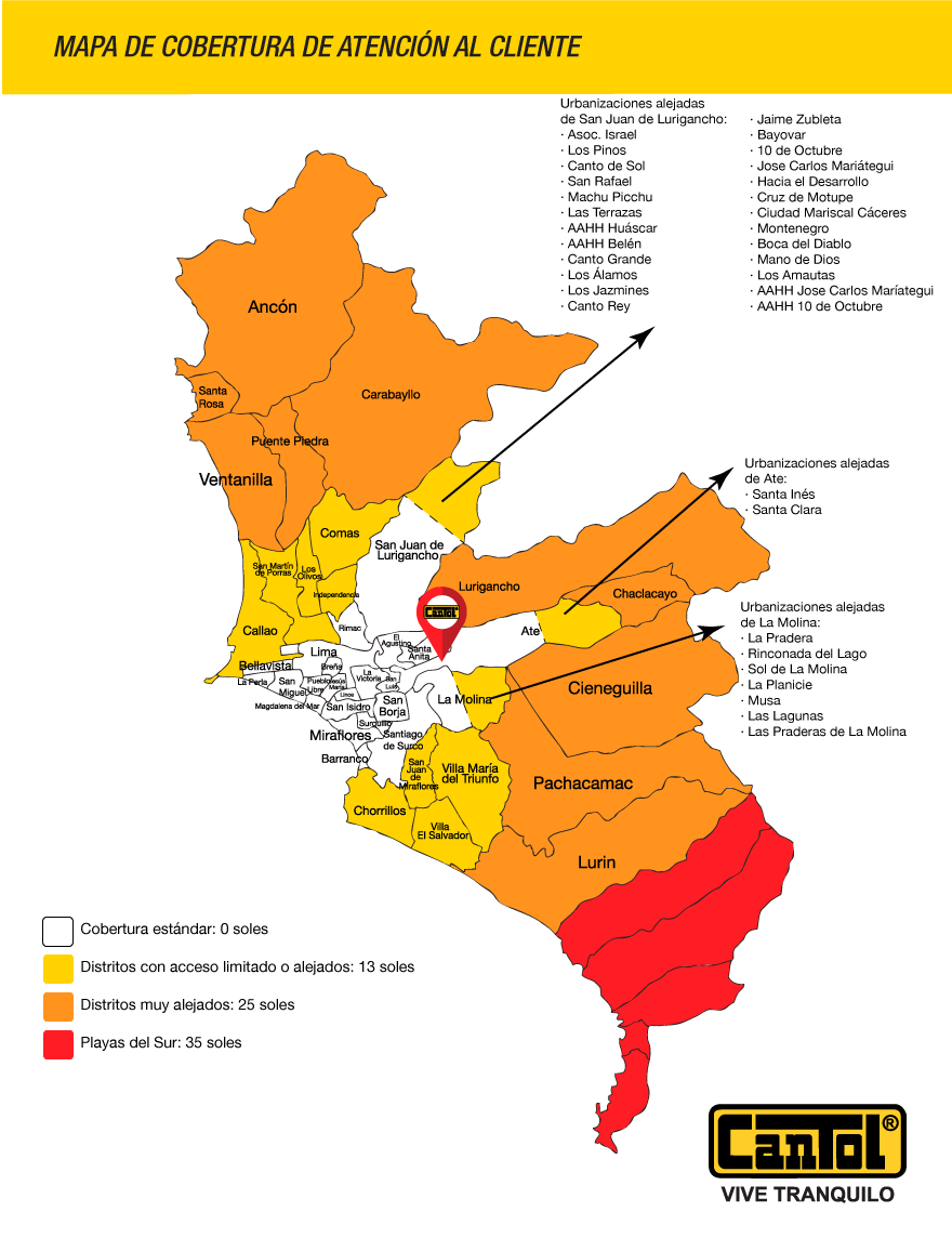 Actualmente el área de Atención al Cliente de Cantol sólo atiende los requerimientos de la ciudad de Lima y alrededores.